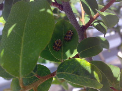 グミの木(鉢植)にいるてんとう虫のさなぎ。(たぶん)